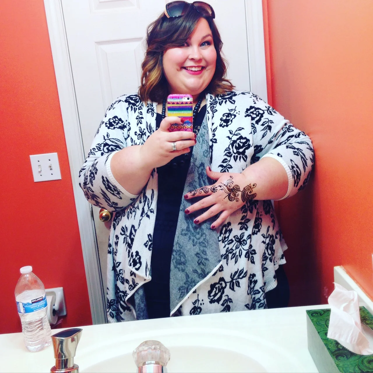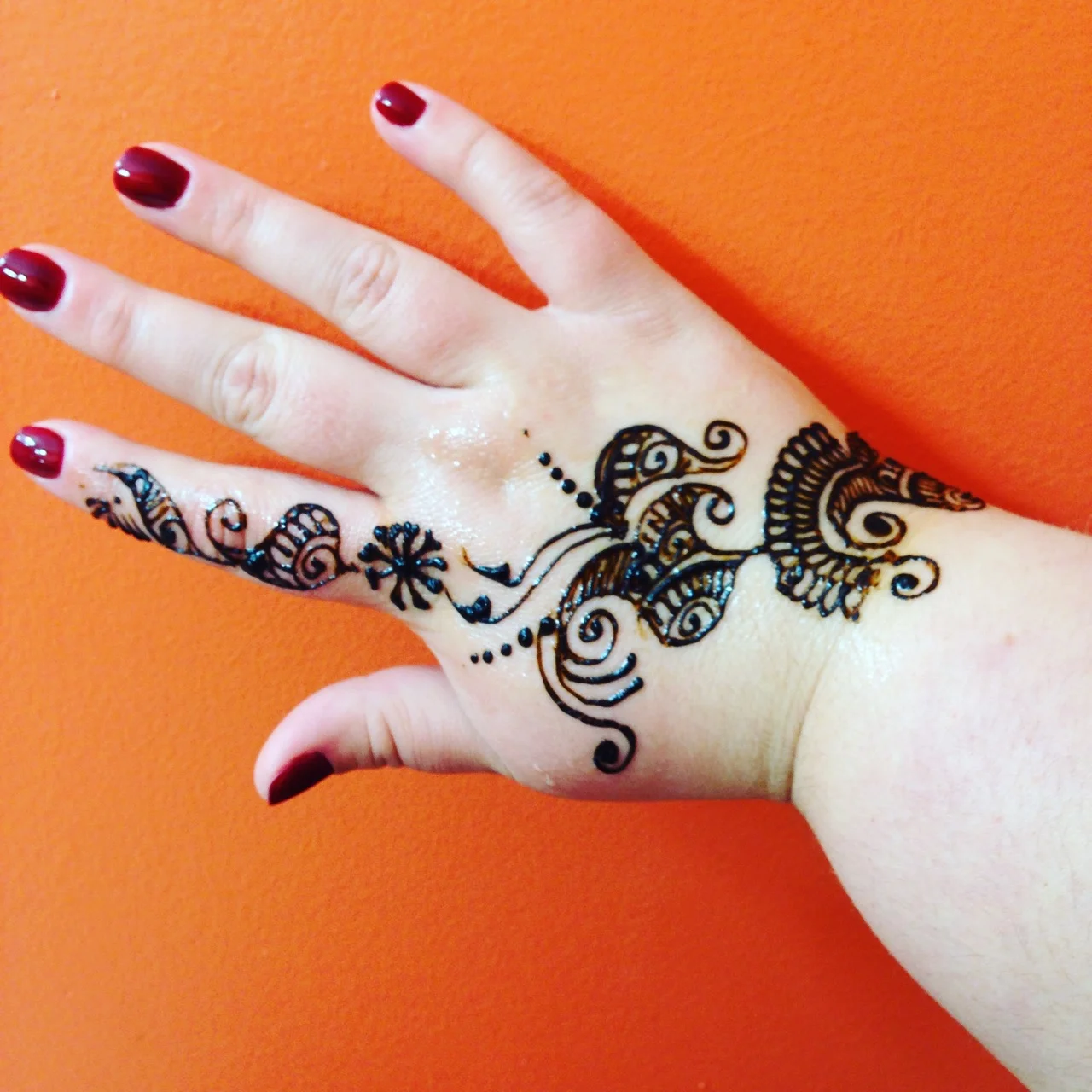 I don't really have a good post-scrape picture... It is quite a few shades lighter though now. Basically they draw the henna on you. You wait an hour - then they seal it with a lemon-sugar syrup. You wait as long as you can before you scrape off the dried paste. Then you're left with a beautiful Henna stain on your hand.