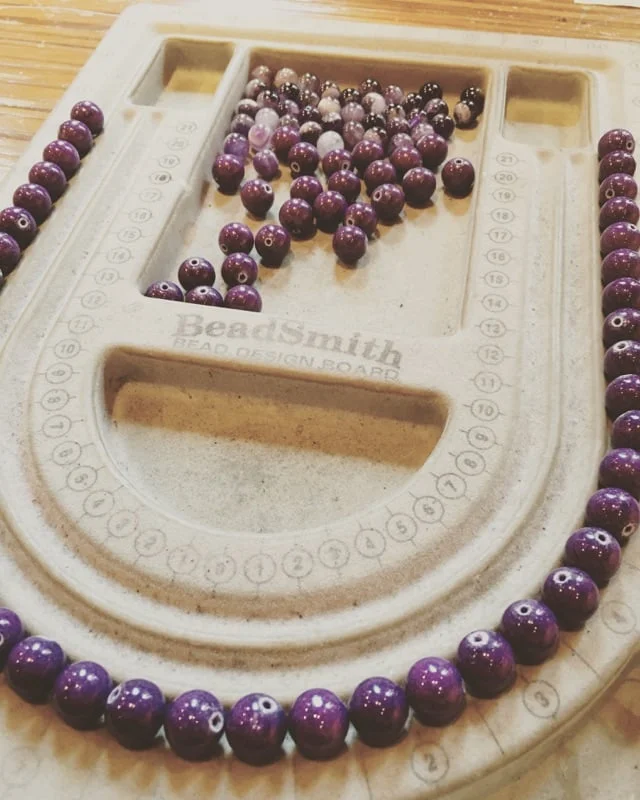 Then I started looking over the beads. All of them were so pretty. I had made a Pinterest board with ideas. Everything from colors to patterns to styles. I have to say, with so many choices in front of me; I was super overwhelmed. I hadn't decided on a color going into it and that added to my anxiety. For some reason, I kept getting drawn into the purple section of "the wall-o-beads". So, I knew I had decided pretty much on having a purple Mala. I really liked the texture of having a bigger bead pass through my fingers. It's just less stressful for me to move through the Mala when the beads are bigger. I'm not experienced enough to want spacers - so I nixed that idea. I wanted something with smooth beads, that would easily pass through as I counted. I feel like I hit that on the head. I wanted beautiful intricate beads, but was also on a budget. So I settled for a solid and then added about 40 or so of the pretty patterned beads. I was so concerned I wouldn't have enough. OR that I would have too many. When I got back to the table, I literally hit 108 ON THE HEAD! I couldn't do that again if I tried. So, after fretting about whether or not I was making the right choice (cosmetically AND for my tight budget this week) that's how I knew it was meant to be.