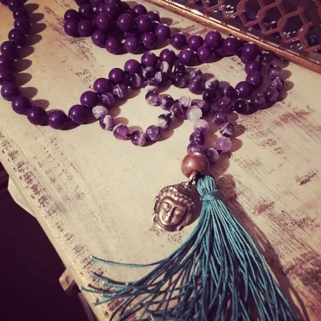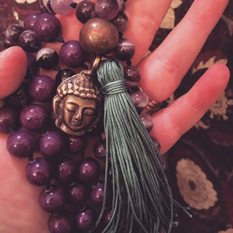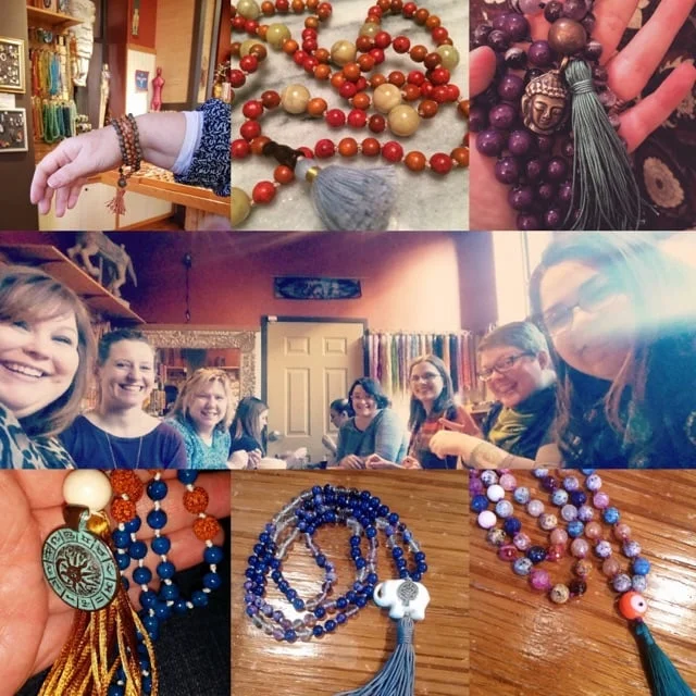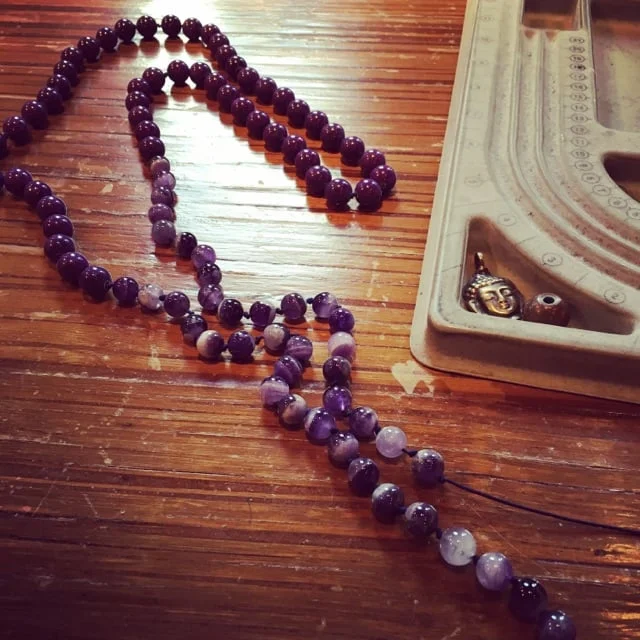 Hello! Happy January! Sunday I ventured into the city and spent the day with my Ganesha girls. We went to a Mala making workshop at Beadniks, Chicago. When I first stepped into the store, it was taken aback. It was absolutely gorgeous! The perfect sanctuary for stringing Mala beads AND they had some pretty fabulous looking jewelry for sale too. We were each given a tray, and some guidelines for picking out the beads we wanted. What would work with what, and what to make sure we had (and didn't have). The first thing that caught my eye was a Buddha head charm on the front table. I went back and grabbed it. I needed this on my Mala.